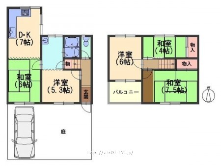 階数 区分 広さ 1F DK 7.0帖 1F 和 6.0帖 1F 洋 5.3帖 2F 和 7.5帖 2F 洋 6.0帖 2F 和 4.0帖 - 駐車場