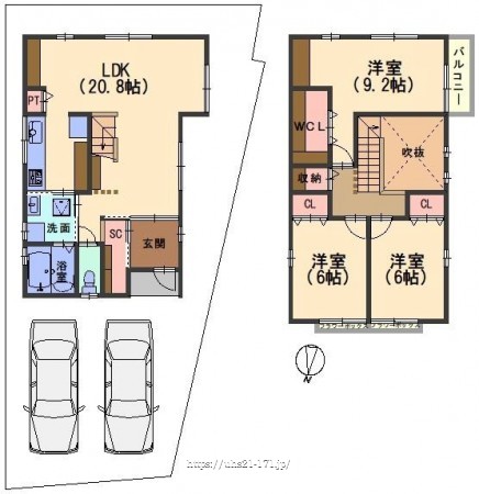 階数 区分 広さ 1F LDK 20.8帖 2F 洋 9.2帖 2F 洋 6.0帖 2F 洋 6.0帖 - 駐車場
