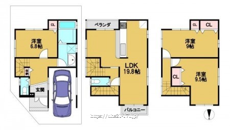 階数 区分 広さ 1F 洋 6.8帖 2F LDK 19.8帖 3F 洋 9.5帖 3F 洋 9.0帖 - 駐車場