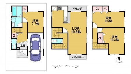 階数 区分 広さ 1F 洋 7.7帖 2F LDK 19.8帖 3F 洋 10.3帖 3F 洋 9.5帖 - 駐車場
