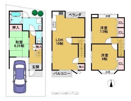 階数 区分 広さ 1F 和 6.3帖 2F LDK 18.0帖 3F 洋 8.0帖 2F 洋 7.5帖 - 駐車場