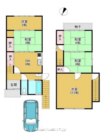 階数 区分 広さ 1F 和 6.0帖 1F DK 6.0帖 1F 洋 5.0帖 2F 洋 12.0帖 2F 和 6.0帖 2F 和 6.0帖 - 駐車場