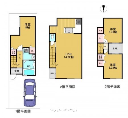 階数 区分 広さ 1F 洋 8.0帖 2F LDK 14.2帖 3F 洋 5.8帖 3F 洋 6.0帖 - 駐車場