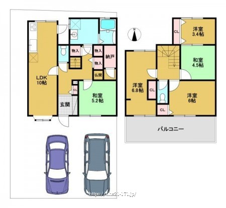 階数 区分 広さ 1F LDK 10.0帖 1F 和 5.2帖 2F 洋 6.8帖 2F 洋 6.0帖 2F 和 4.5帖 2F 洋 3.4帖 - 駐車場