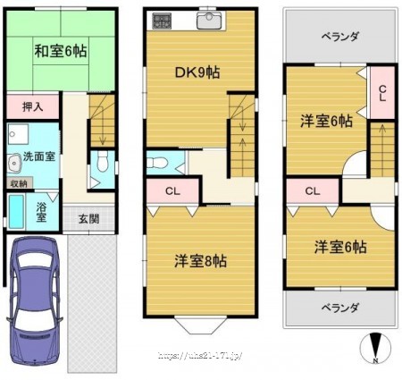 階数 区分 広さ 1F 和 6.0帖 2F DK 9.0帖 2F 洋 8.0帖 3F 洋 6.0帖 3F 洋 6.0帖 - 駐車場