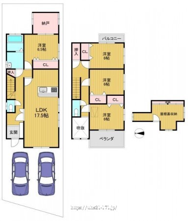 階数 区分 広さ 1F LDK 17.5帖 1F 洋 6.5帖 2F 洋 6.0帖 2F 洋 6.0帖 2F 洋 6.0帖 - 駐車場