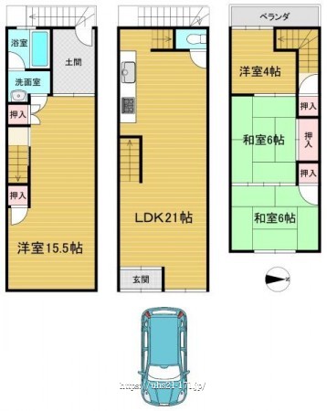 階数 区分 広さ 1F 洋 15.5帖 2F LDK 21.0帖 3F 和 6.0帖 3F 和 6.0帖 3F 洋 4.0帖 - 駐車場