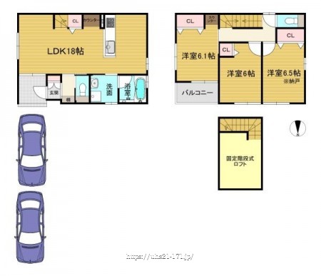 階数 区分 広さ 1F LDK 18.0帖 2F S 6.5帖 2F 洋 6.1帖 2F 洋 6.0帖 - 駐車場