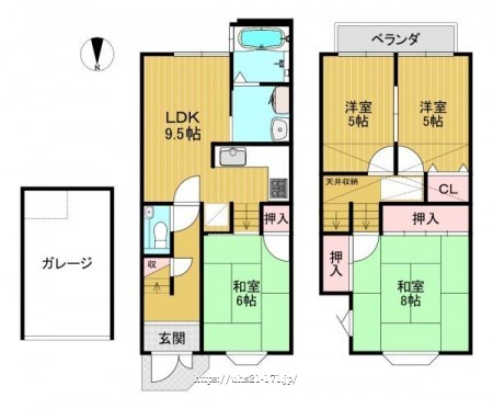 階数 区分 広さ 1F LDK 9.5帖 1F 和 6.0帖 2F 和 8.0帖 2F 洋 5.0帖 2F 洋 5.0帖 - 駐車場