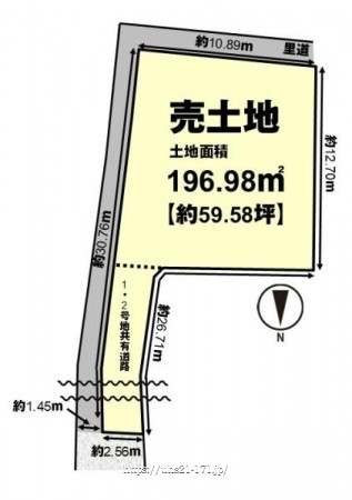 - ※2号地通路部分は1号地と共有通路とし、里道を含む幅員4mの通路に対し、1号地は約12.30m、2号地は約13.74mの間口がございます。