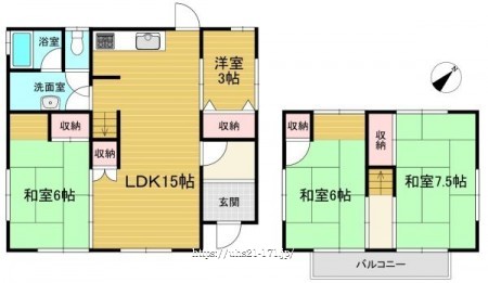 階数 区分 広さ 1F LDK 15.0帖 1F 和 6.0帖 1F 洋 3.0帖 2F 和 7.5帖 2F 和 6.0帖 - 駐車場