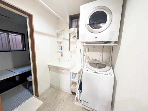 洗面室/洗面台新設、洗濯パン設置、天井・クロス貼り、床クッションフロア張、建具新設