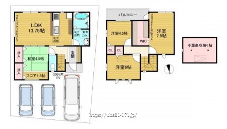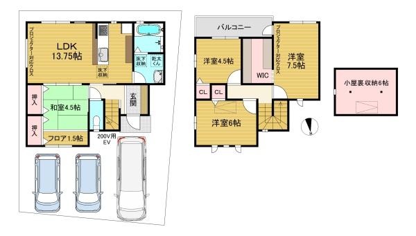 階数 区分 広さ 1F LDK 13.6帖 1F 和 6.0帖 2F 洋 7.5帖 2F 洋 6.0帖 2F 洋 4.5帖 - 駐車場