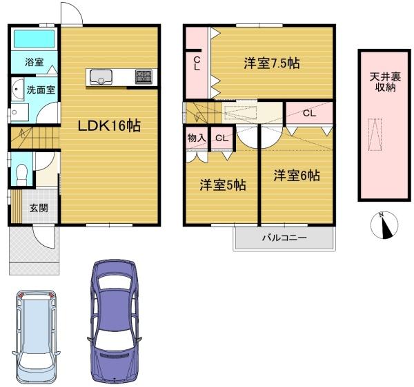 階数 区分 広さ 1F LDK 16.0帖 2F 洋 7.5帖 2F 洋 6.0帖 2F 洋 5.0帖 - 駐車場