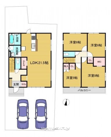 階数 区分 広さ 1F LDK 21.5帖 2F 洋 8.0帖 2F 洋 6.0帖 2F 洋 6.0帖 2F 洋 5.0帖 - 駐車場