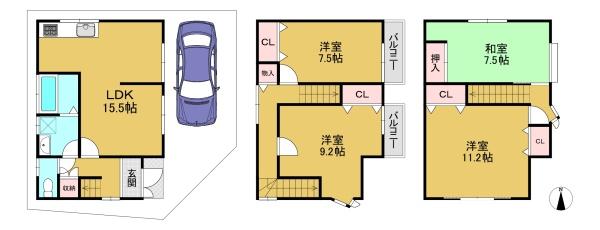 階数 区分 広さ 1F LDK 15.5帖 2F 洋 9.2帖 2F 洋 7.5帖 3F 洋 11.2帖 3F 和 7.5帖 - 駐車場