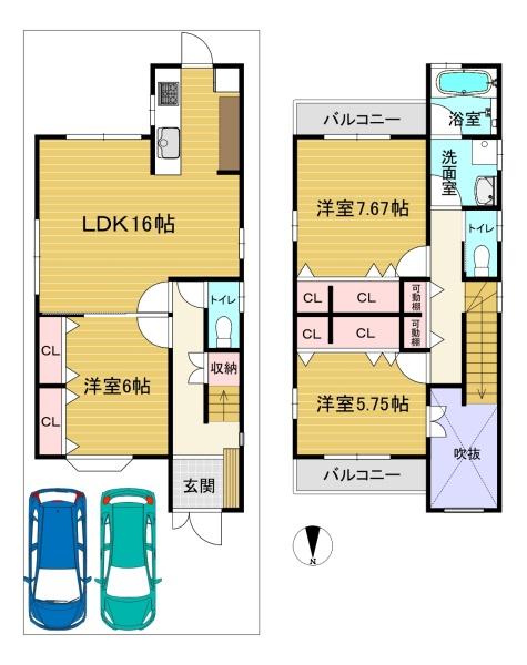 階数 区分 広さ 1F LDK 16.0帖 1F 洋 6.0帖 2F 洋 7.7帖 2F 洋 5.8帖 - 駐車場