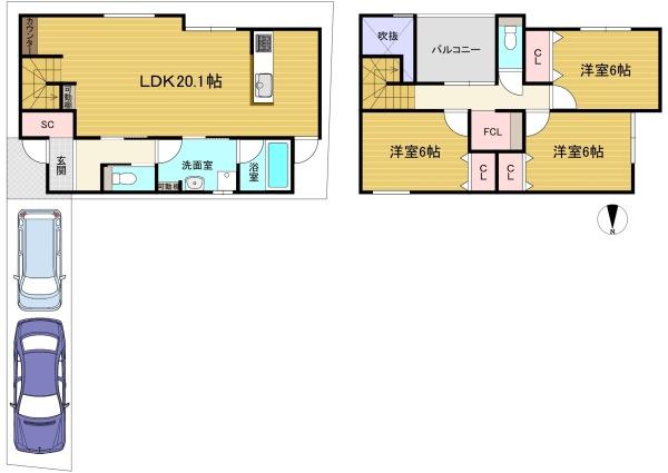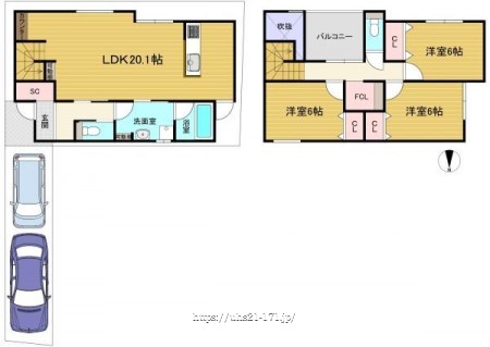 階数 区分 広さ 1F LDK 20.1帖 2F 洋 6.0帖 2F 洋 6.0帖 2F 洋 6.0帖 - 駐車場