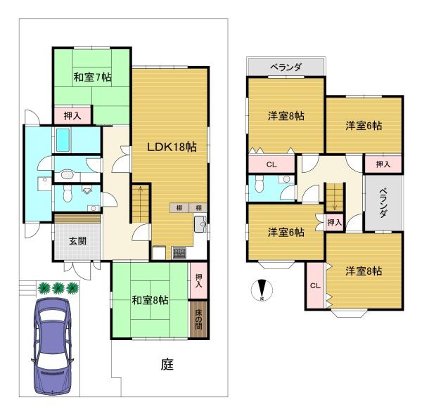階数 区分 広さ 1F LDK 18.0帖 1F 和 8.0帖 1F 和 7.0帖 2F 洋 8.0帖 2F 洋 8.0帖 2F 洋 6.0帖 2F 洋 6.0帖 - 駐車場
