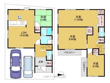 階数 区分 広さ 1F LDK 19.6帖 1F 和 4.5帖 2F 洋 12.0帖 2F 洋 9.7帖 2F 洋 6.5帖 - 駐車場