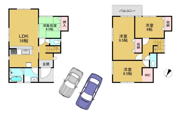 階数 区分 広さ 1F LDK 16.0帖 1F 和 4.5帖 2F 洋 9.5帖 2F 洋 6.5帖 2F 洋 6.0帖 - 駐車場