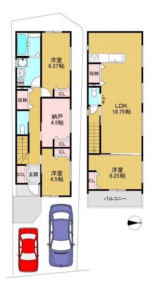 階数 区分 広さ 1F 洋 6.4帖 1F 洋 4.5帖 1F S 4.5帖 2F LDK 18.8帖 2F 洋 6.3帖 - 駐車場