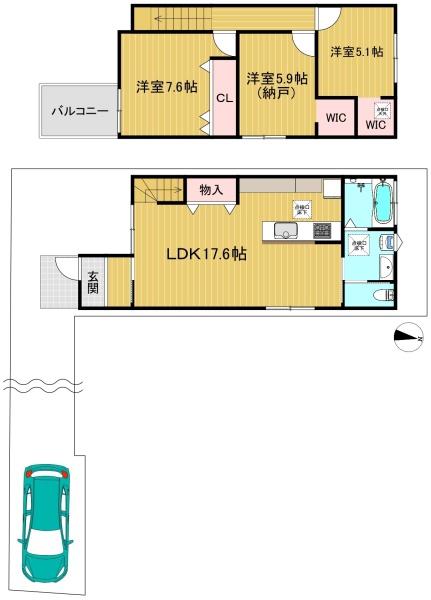 階数 区分 広さ 1F LDK 17.6帖 2F 洋 7.9帖 2F 洋 5.9帖 2F 洋 5.1帖 - 駐車場