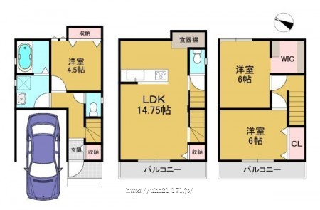 階数 区分 広さ 1F 洋 4.5帖 2F LDK 14.8帖 3F 洋 6.0帖 3F 洋 6.0帖 - 駐車場