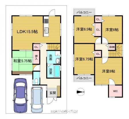 階数 区分 広さ 1F LDK 15.5帖 1F 和 5.8帖 2F 洋 8.0帖 2F 洋 6.8帖 2F 洋 6.5帖 2F 洋 6.0帖 - 駐車場