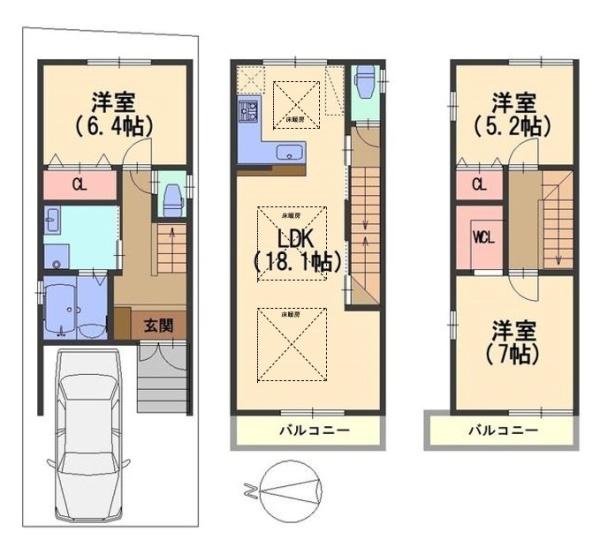 階数 区分 広さ 1F 洋 6.4帖 2F LDK 18.1帖 3F 洋 7.0帖 3F 洋 5.2帖 - 駐車場