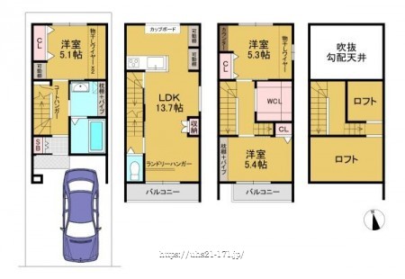階数 区分 広さ 1F 洋 5.1帖 2F LDK 13.7帖 3F 洋 5.4帖 3F 洋 5.3帖 - 駐車場
