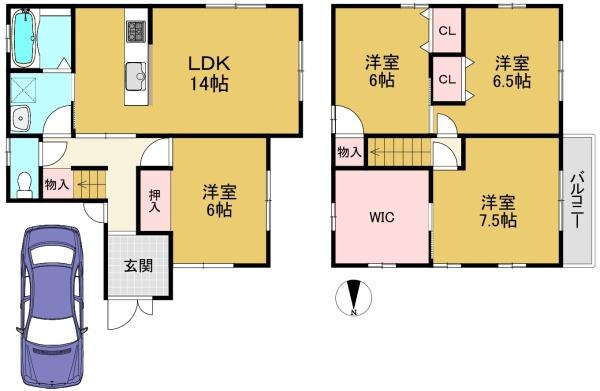 階数 区分 広さ 1F LDK 14.0帖 1F 洋 6.0帖 2F 洋 7.5帖 2F 洋 6.5帖 2F 洋 6.0帖 - 駐車場