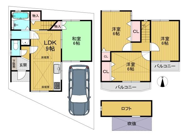 階数 区分 広さ 1F LDK 9.0帖 1F 和 6.0帖 2F 洋 6.0帖 2F 洋 6.0帖 2F 洋 6.0帖 - 駐車場