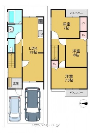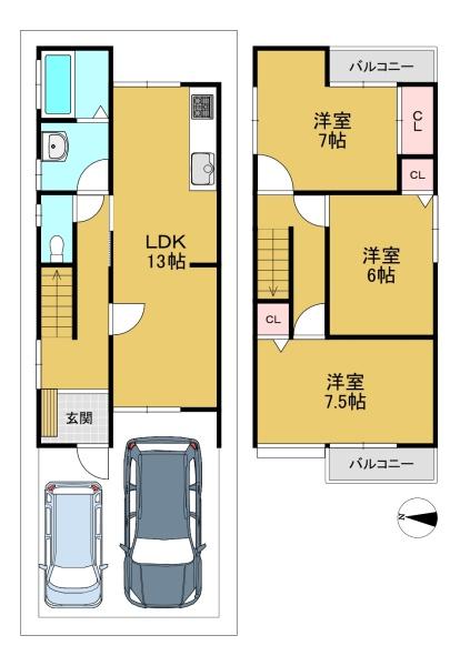 階数 区分 広さ 1F LDK 13.0帖 1F 洋 7.5帖 2F 洋 7.0帖 2F 洋 6.0帖 - 駐車場