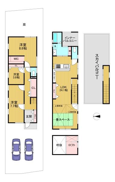 階数 区分 広さ 1F LDK 24.1帖 2F 洋 8.8帖 2F 洋 7.7帖 2F 洋 3.8帖 - 駐車場