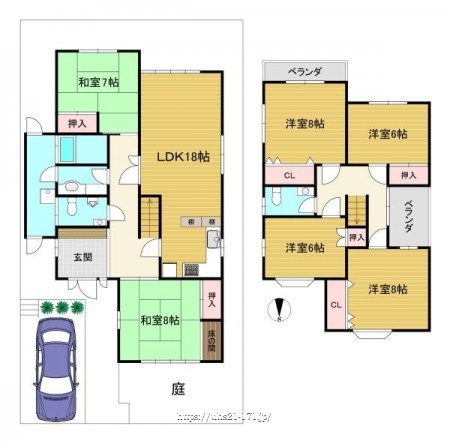階数 区分 広さ 1F LDK 18.0帖 1F 和 8.0帖 1F 和 7.0帖 2F 洋 8.0帖 2F 洋 8.0帖 2F 洋 6.0帖 2F 洋 6.0帖 - 駐車場