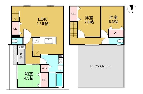 階数 区分 広さ 1F LDK 17.6帖 1F 和 4.5帖 2F 洋 7.3帖 2F 洋 6.3帖 - 駐車場
