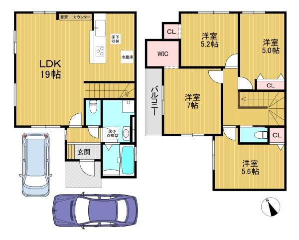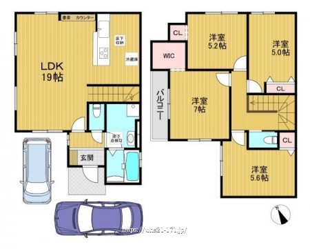 階数 区分 広さ 1F LDK 19.0帖 2F 洋 7.0帖 2F 洋 5.6帖 2F 洋 5.2帖 2F 洋 5.0帖 - 駐車場