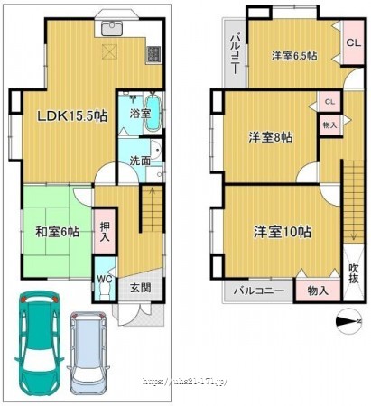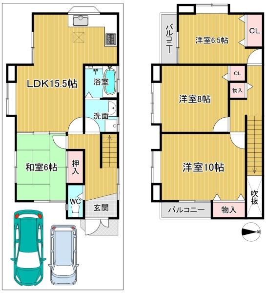 階数 区分 広さ 1F LDK 15.5帖 1F 和 6.0帖 2F 洋 10.0帖 2F 洋 8.0帖 2F 洋 6.5帖 - 駐車場