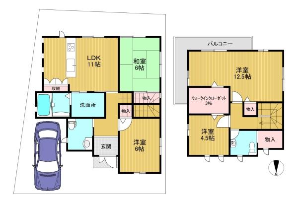 階数 区分 広さ 1F LDK 11.0帖 1F 洋 6.0帖 1F 和 6.0帖 2F 洋 12.5帖 2F 洋 4.5帖 - 駐車場