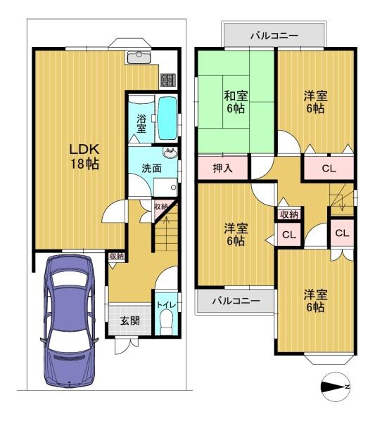 階数 区分 広さ 1F LDK 18.0帖 1F 洋 6.0帖 2F 洋 6.0帖 2F 洋 6.0帖 2F 和 6.0帖 - 駐車場